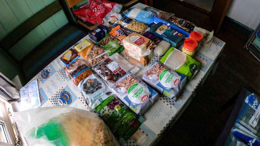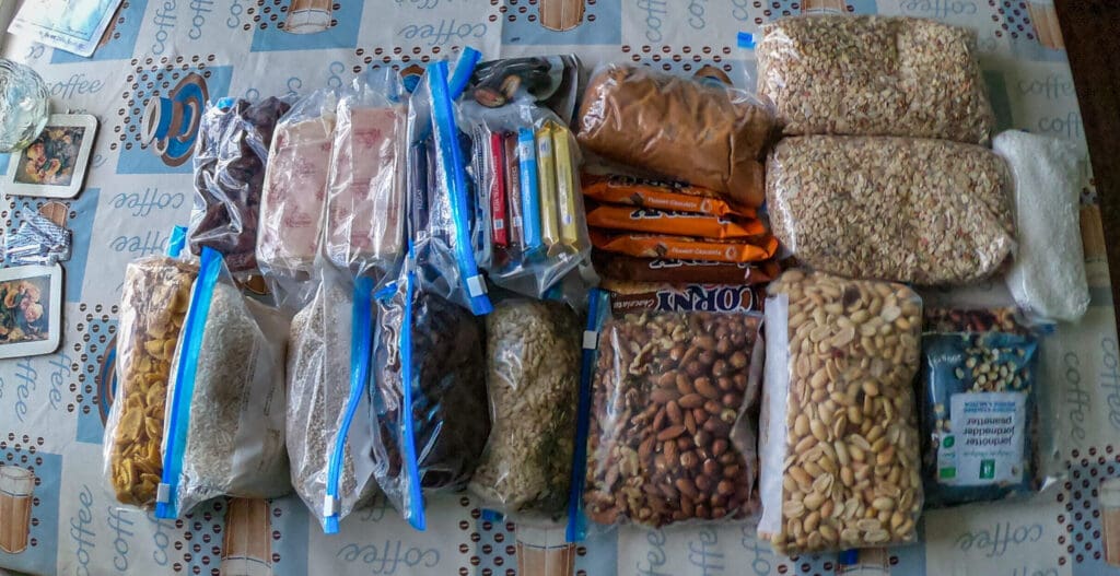 Auf den Bildern ist Nahrung für 3 Wochen Essen zu sehen: Vor und nach dem Umpacken. Die Erdnussbutter verfügt über dermassen viel Kalorien, dass sie gerne auf Expeditionen gesehen wird. Doch im Glas ist sie zu schwer.