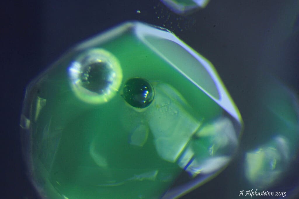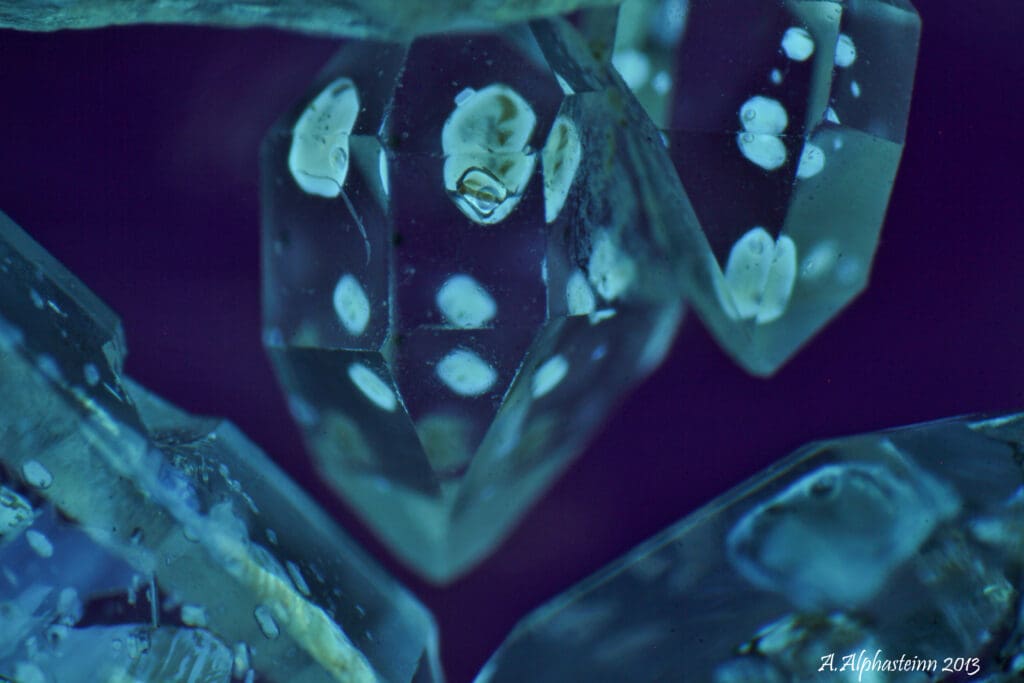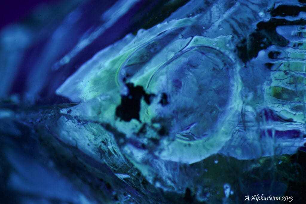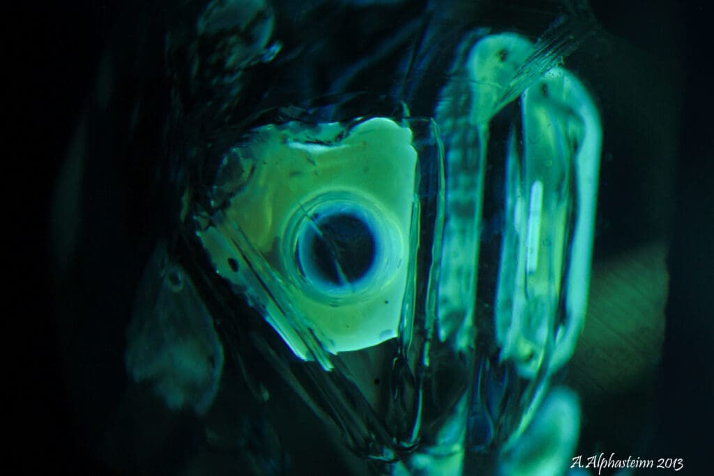 Dies bedeutet, dass einst der Phytoplankton auf dem Meeresgrund gebunden wurde, um Millionen Jahre später in einigen der Kristalle konserviert zu werden. Unter dem Neonlicht wird dieses seltene Schauspiel sichtbar.